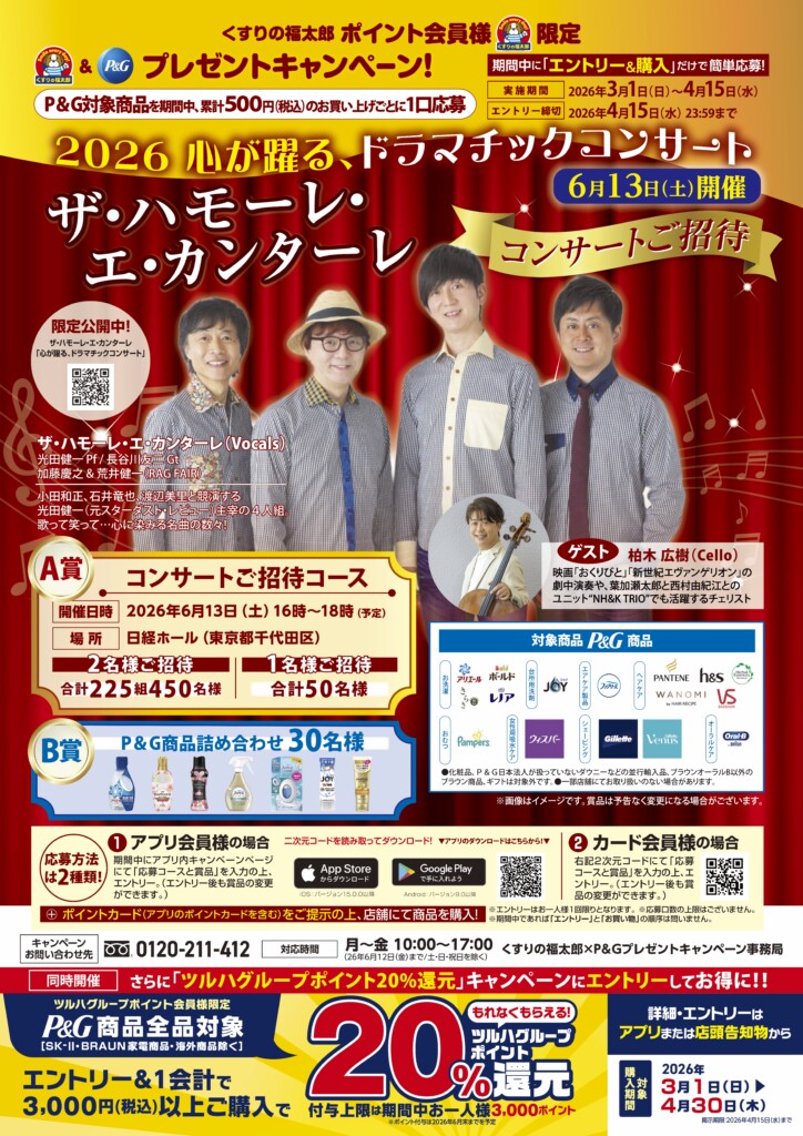 2026年4月15日(水)まで、くすりの福太郎で対象のP&G商品を¥500(税込)ご購いただくと1口ご応募可能です。スペシャルなコンサートへ沢山のご応募をぜひお待ちしております!